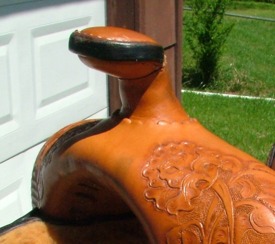 The #1 horn is standard on reining saddles and most general prupose western saddles. It is fairly short and is out of the way of the reins. It is shown here on the Basket of Roses Reiner.